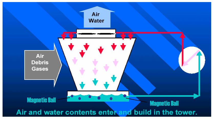To use Magnetic Ball, just put ball or balls into a place of water inflow or outflow in cooling tower. If necessary, bind iron-chain on pipe to fix the balls.